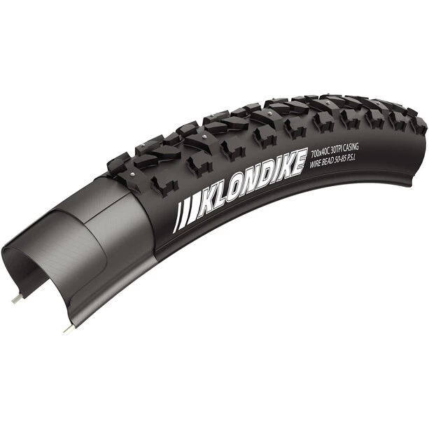 Les 100 crampons, qui font également office de pneu mince de 29 pouces, offrent la traction dont vous avez besoin dans presque tous les environnements hivernaux. Le Klondike Skinny a un profil mis à jour par rapport au modèle classique du Klondike qui présente une ligne centrale lisse, tandis que les crampons creusent les parois latérales et repoussent la saleté, et que l’alternance de pointes au carbure vous maintient droit sur votre vélo.